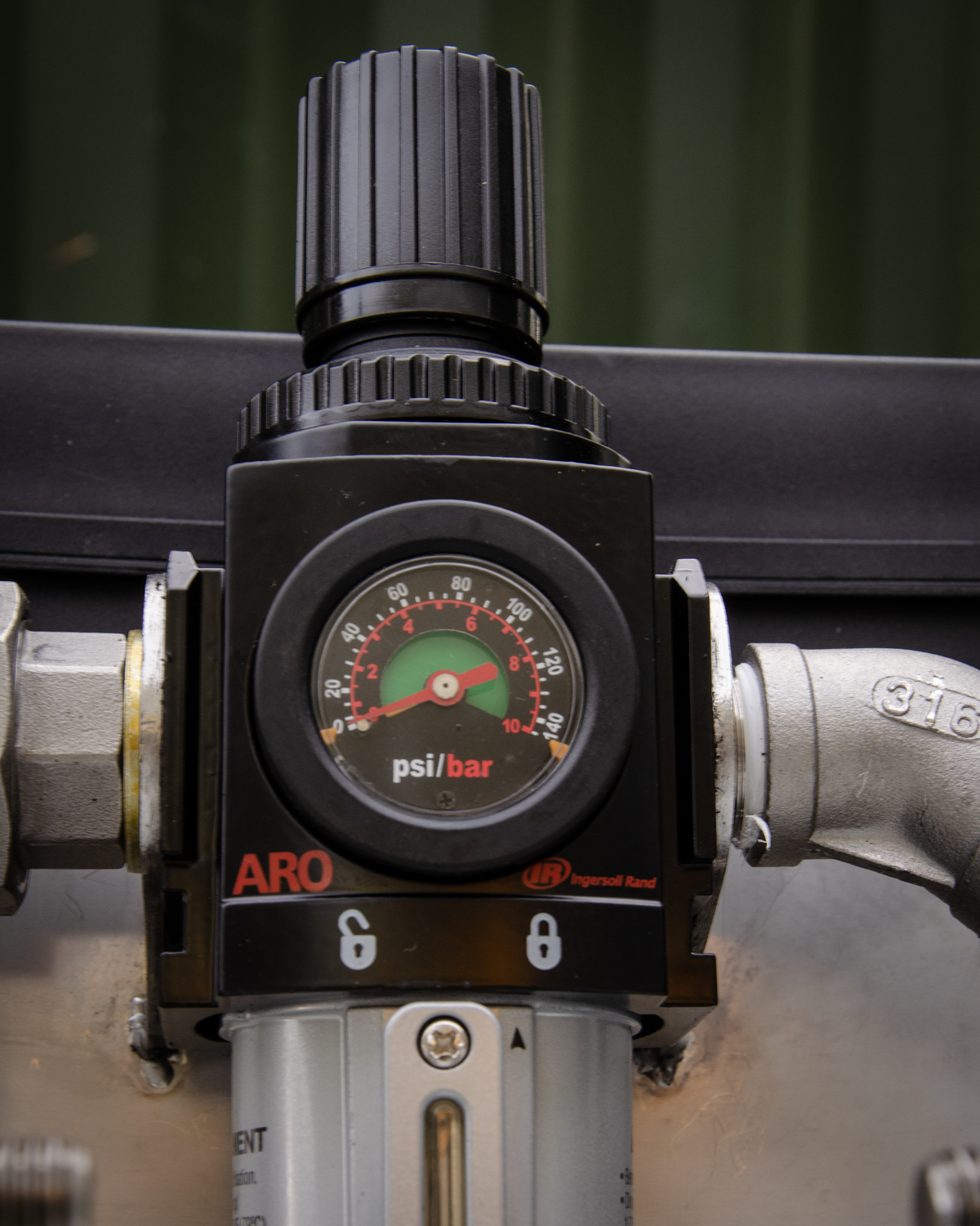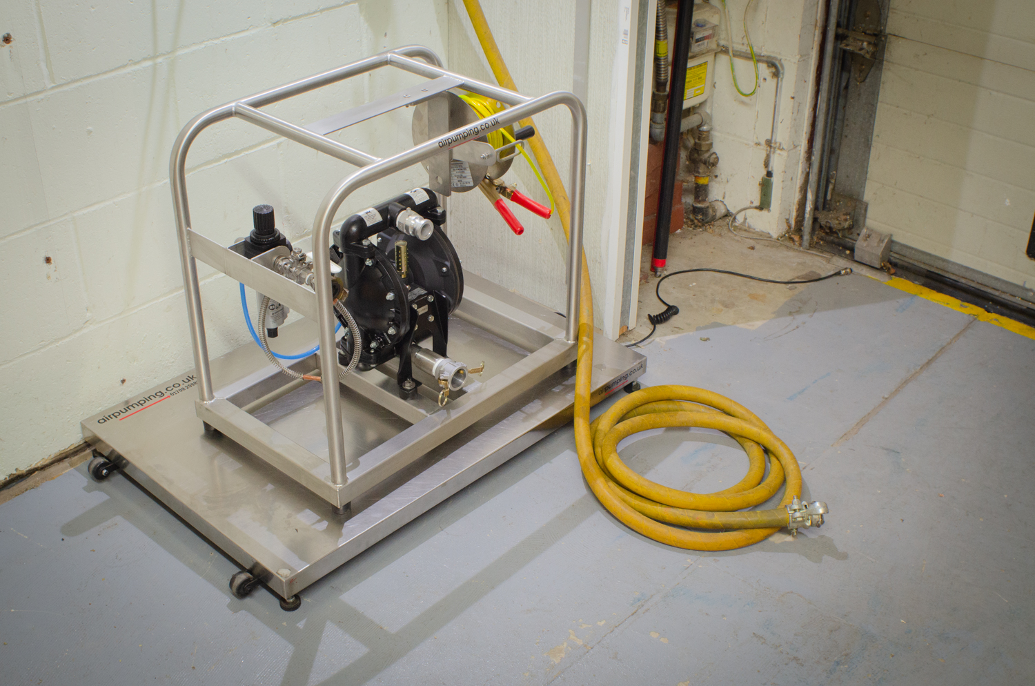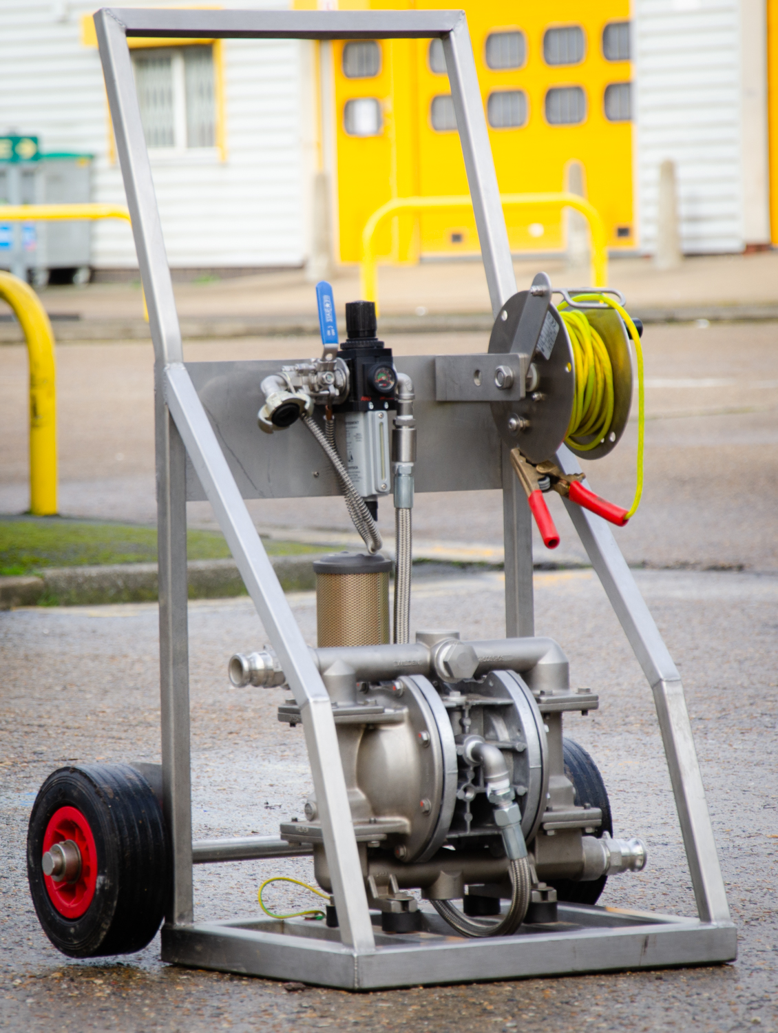 On the right is one of our Wilden Transfer pumps. As you can guess, built fully in Polypropylene this pump is quite a size and weight to move about - especially with product adding weight inside it. Lumping this unit around site would be a workout in itself, not to mention the health and safety aspect with regards to lifting and risks of contact with dangerous fluids. The trolley bypasses all these issues simply. We have also included an earthing strap for grounding on our fuel pumps just to eliminate even the slightest possibility of spark, whip-check straps, and a full air filter regulator device allowing the pump to be easily controlled and monitored. This helps to ensure the cleanest of supplies from your compressor.